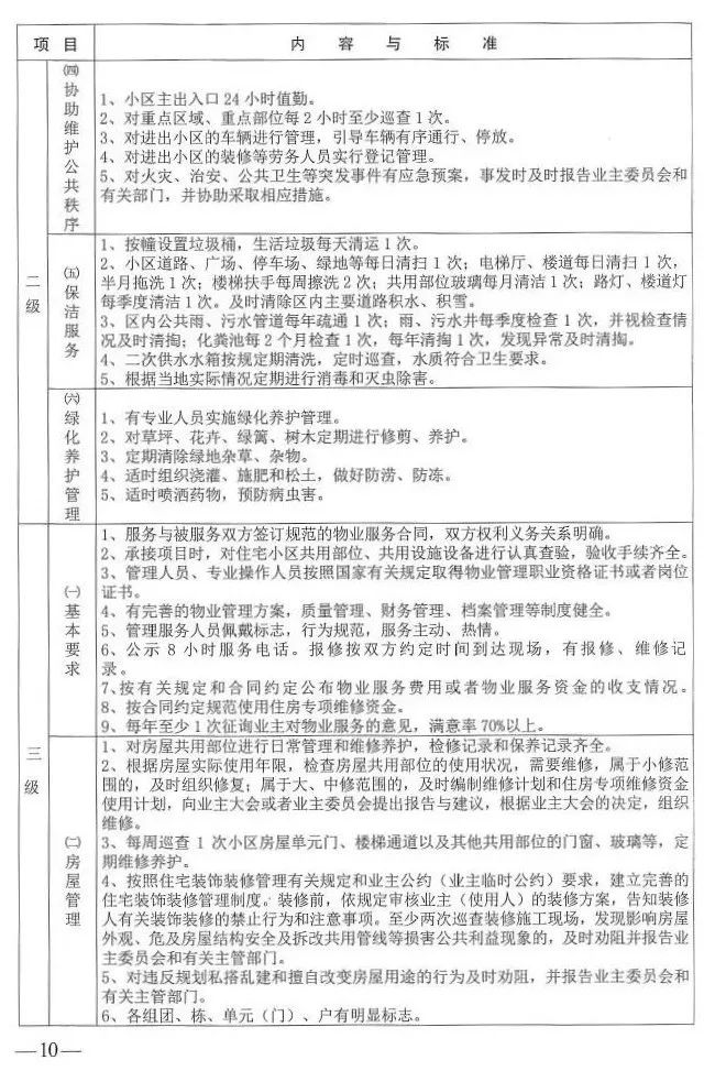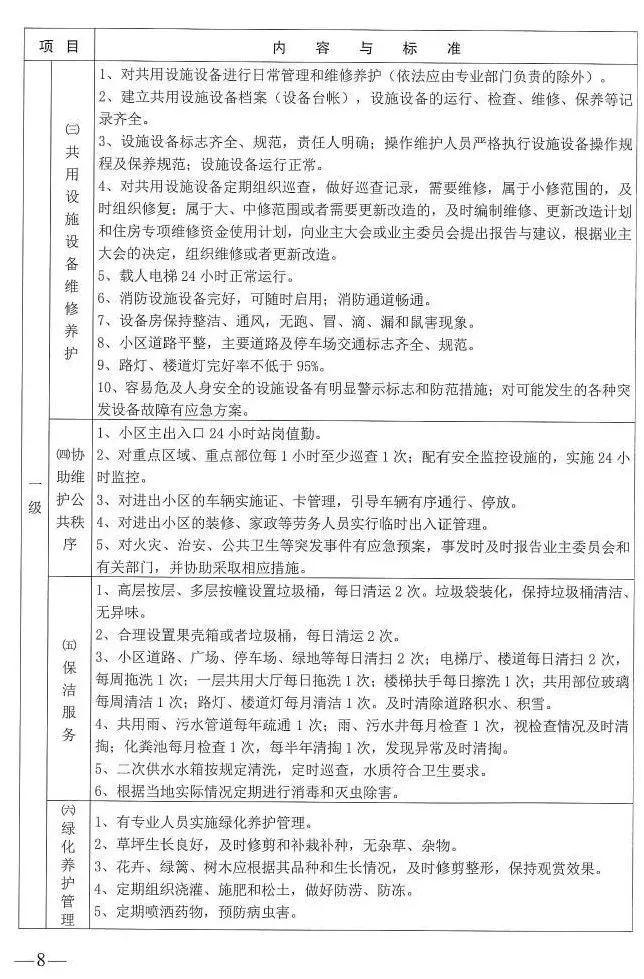 通知规范了住宅前期物业服务收费标准,普通住宅小区物业管理服务标准,车位(库)服务费等物业服务标准,具体内容如下: