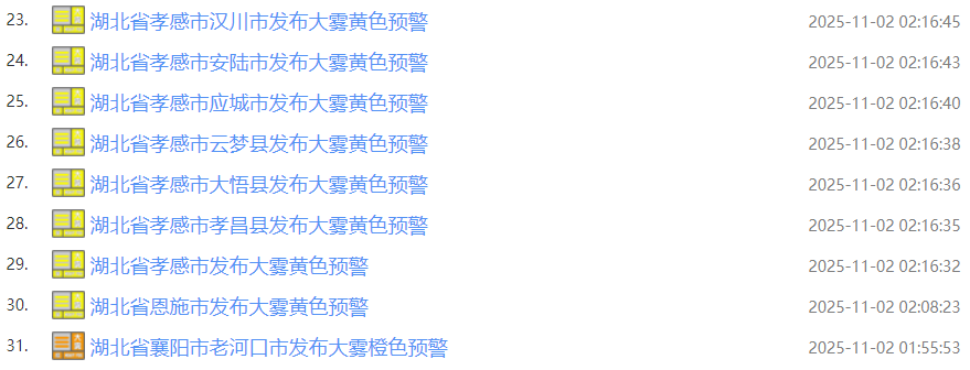 11月2日,据湖北省气象局网站消息,截至今晨8时,湖北连发31条大雾预警,涉及武汉、随州、咸宁、黄石、十堰、襄阳、孝感、恩施市等地。